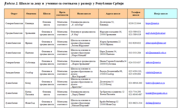 Tabela 2. Škole za decu i  učenike sa smetnjama u razvoju u Republici Srbiji