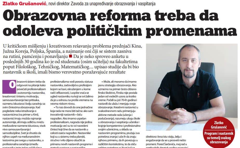 Интервју директора Завода мр Златка Грушановића, као и министра просвете, науке и технолошког развоја Младена Шарчевића и Весне Недељковић помоћнице министра просвете за предшколско и основно образовање специјалном издању листа „Данас“ поводом почетка школске године, можете прочитати овде („Данас школа“).