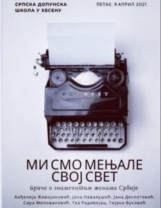 Животи познатих жена заинтересовали су их па су пожелели да историју оживе. Шест ученица допунске школе су се нашле у улогама Милице Хребељановић, Јефимије, Милунке Савић, Катарине Ивановић, Данице Томић и Јелисавете Начић у филму ,,Ми смо мењале свој свет“. Филм је замишљен у виду шест монолога наводно пронађених у временској капсули. Премијерно је приказан 9. априла 2021. године када је подељен на друштвеним мрежама, а пре филма приказани су најава и плакат, такође настали као резултат ученичког рада уз менторство наставника. Филм и најаву можете погледати на следећим линковима