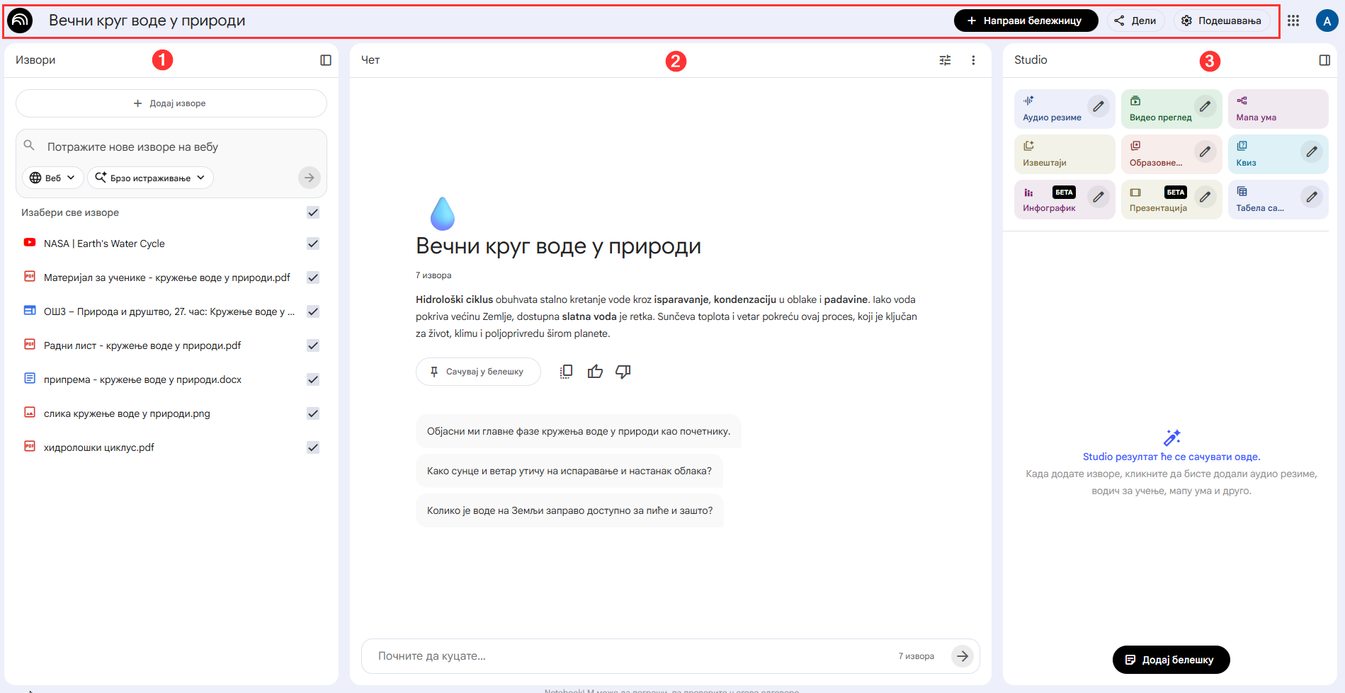НАША ПРЕПОРУКА: ви и ваши ученици увек треба да користите NotеbookLM са својим школским налозима (@vasaskola.edu.rs) како бисте осигурали максималну заштиту података и искористили пун потенцијал модела и интеграције са осталим Google алатима.